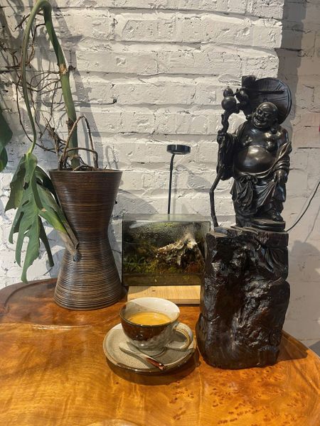 Một điểm nhấn đặc biệt trong không gian Bameca chính là tượng Di Lặc bằng gỗ. Tượng thường được đặt tại vị trí trang trọng nhất – ngay gần cửa vào hoặc trên kệ chính, nơi mọi ánh nhìn đều có thể chạm tới. Vị Phật với nụ cười hiền hậu, thân hình tròn trịa và ánh mắt từ bi ấy không chỉ là một tác phẩm mỹ thuật, mà còn là biểu tượng tâm linh đầy ý nghĩa.